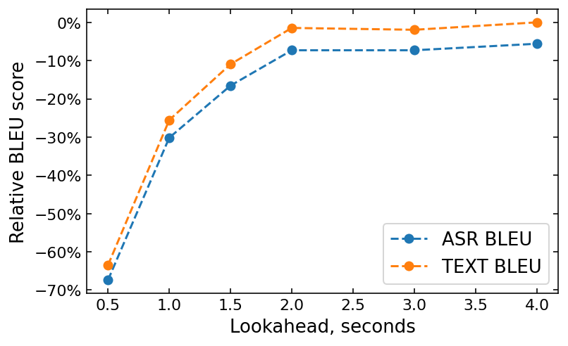 リアルタイム会話では、標準的に2秒の遅延が使用されており、これはほとんどの言語に適しています。lookaheadを長くすると、より多くの文脈が得られるため翻訳品質は向上しますが、リアルタイムコミュニケーション体験には悪影響を及ぼします。Googleの実験では、スペイン語・英語の言語ペアにおいて、lookaheadの長さとBLEUスコアの関係が示されています。
