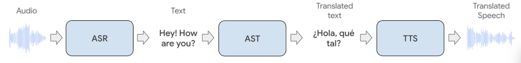 従来のリアルタイム音声翻訳技術は、カスケード方式と呼ばれる3段階の処理を経由していました。まず、音声認識(ASR)で元の音声をテキストに変換し、次に機械翻訳(MT)でテキストを目標言語に翻訳し、最後にテキスト読み上げ(TTS)で音声に戻すという流れです。