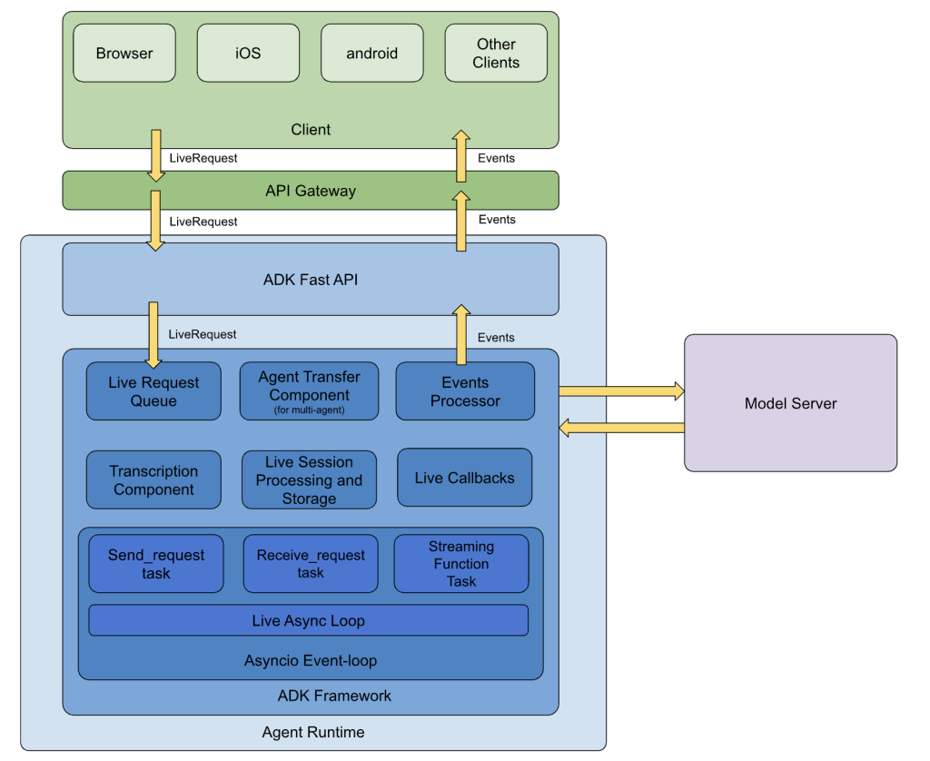 連続的なマルチモーダル入力(テキスト、音声/映像ブロブ)を処理するため、ADKはLiveRequestQueueという重要な抽象化を導入しています。このasyncioベースのキューにより、クライアントアプリケーションは到着時に様々なデータ型をシームレスにエンキューできます。エージェントの非同期ランナー(run_live)がこのキューから消費し、正式な「ターン終了」を待つことなくモデルがほぼリアルタイムでデータを処理できます。