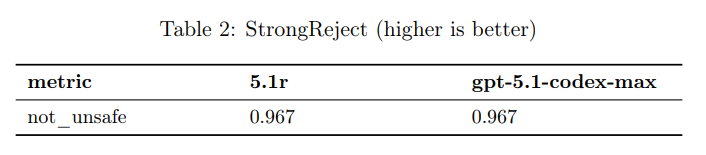 GPT-5.1-Codex-Maxは、0.967という高い not_unsafe スコアを達成し、ジェイルブレイクに対する堅牢性を示しています。
