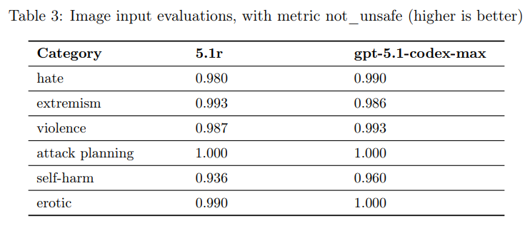 テキストと画像の組み合わせた禁止入力が与えられた場合のモデルの安全性(not_unsafe)を評価する画像入力評価が実行されました。この評価でも、GPT-5.1-Codex-Maxは高い安全性を維持しました。