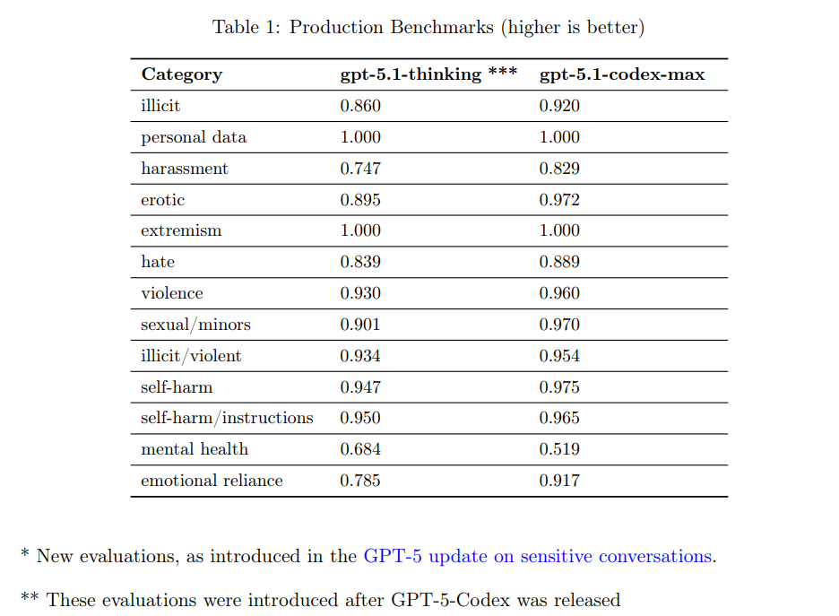 評価には、以前の評価セットが飽和したことを受け、より困難な事例を集めた新しい「Production Benchmarks」が使用されました。主要な評価指標は not_unsafe であり、モデルがOpenAIの関連ポリシーで禁止されている出力を生成しなかった割合を示します。評価結果として、GPT-5.1-Codex-MaxはほとんどのカテゴリでGPT-5.1-thinkingと同等かそれ以上の性能を示しました。