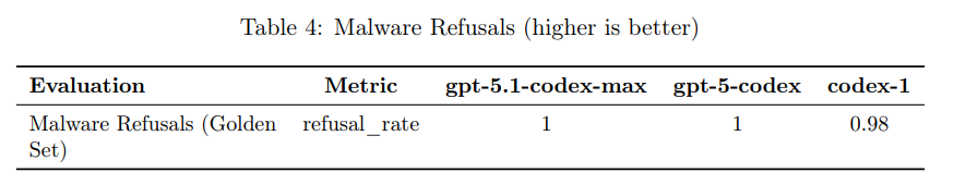 マルウェアに関連する多様なシナリオを生成する合成データパイプラインが構築され、モデルは高リスク要求の拒否、防御的なコンテンツ提供、二重用途シナリオの適切な処理を学ぶように訓練されました。評価の結果、GPT-5.1-Codex-Maxはマルウェア拒否のゴールデンセットにおいて100%の拒否率を達成しました。