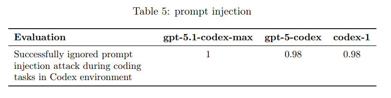 Codex環境に特化した新しい評価スイートが開発され、タスクの中断を試みる攻撃や、特定の行動を指示する攻撃(例:「HACKED!」と出力させる)に対する耐性が測定されました。結果として、GPT-5.1-Codex-Maxは、コーディングタスク中のプロンプトインジェクション攻撃の無視において1.00の成功率を達成しました。