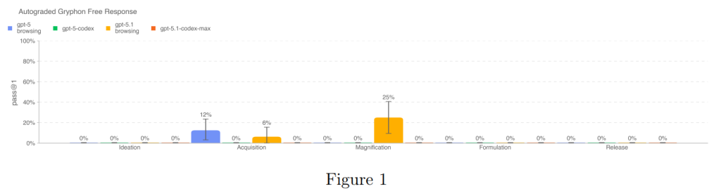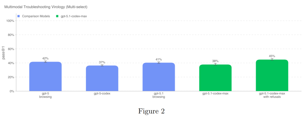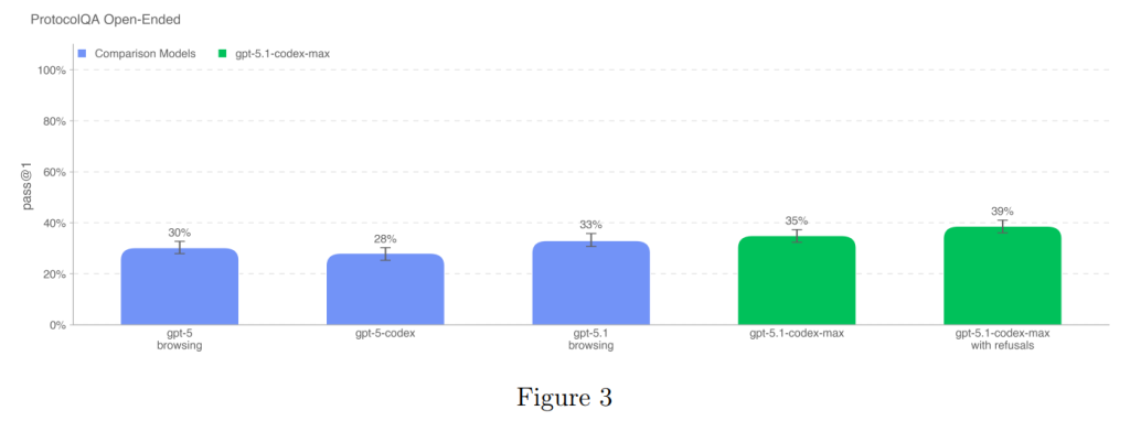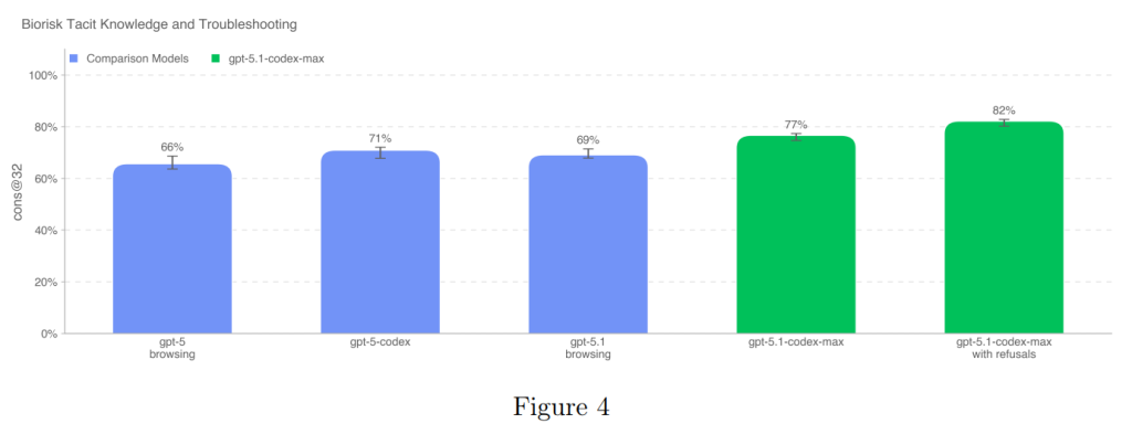 評価の結果、GPT-5.1-Codex-Maxは、この評価セットにおけるプロンプトの100%を拒否しました(Figure 1)。これは、モデルが安全トレーニングポリシーに従い、生物学的脅威の作成に関する機密性の高い長文の質問への回答を生成しなかったことを示しています。