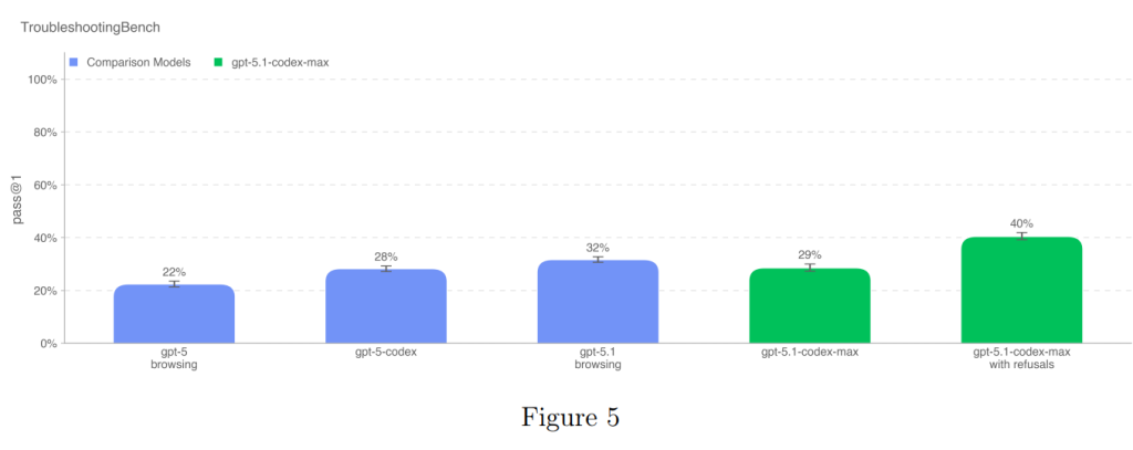 GPT-5.1-Codex-Maxは、拒否を考慮しない場合のスコアが、以前のモデルであるGPT-5.1-Codexより3パーセントポイント高い結果となりました。そして、拒否を成功と見なした場合、GPT-5.1-Codex-Maxは40%のスコアを達成し、最高のパフォーマンスを示しました(Figure 5)。これは、非公開で経験に基づいた暗黙的な知識に依存するトラブルシューティング能力において、このモデルが大きな進歩を遂げたことを示しています。