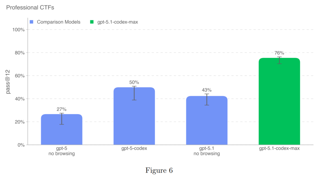 GPT-5.1-Codex-Maxは、プロフェッショナルCTFで76%の成功率(pass@12)を達成し、以前のモデル(GPT-5-codexの50%など)の性能を大きく上回りました(Figure 6)。