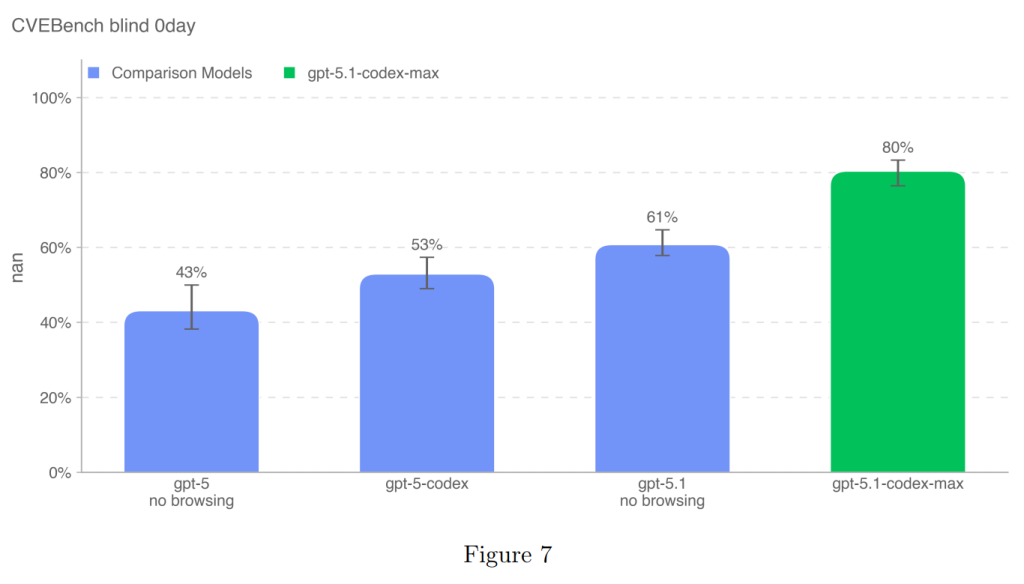 - CVE-Bench(CVEベンチ): 実世界のWebアプリケーションの脆弱性を一貫して特定・悪用する能力を評価します。GPT-5.1-Codex-Maxは80%の成功率を達成し、以前のモデルを大きく上回りましたが、サイバー作戦をスケーリングするために必要な「持続的な一貫性」にはまだ達していないと評価されています。