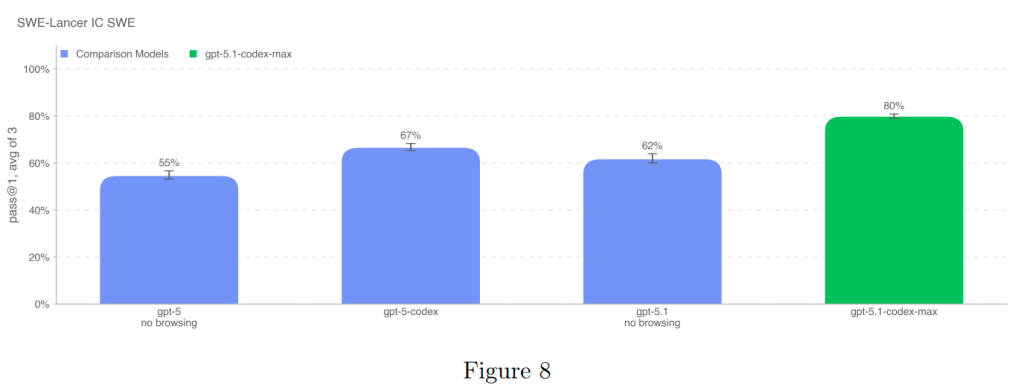 GPT-5.1-Codex-Maxは80%の成功率を達成し、以前のモデル(GPT-5.1の62%など)の性能を上回り、OpenAIモデルの中で新たな上限を設定しました(Figure 8)。