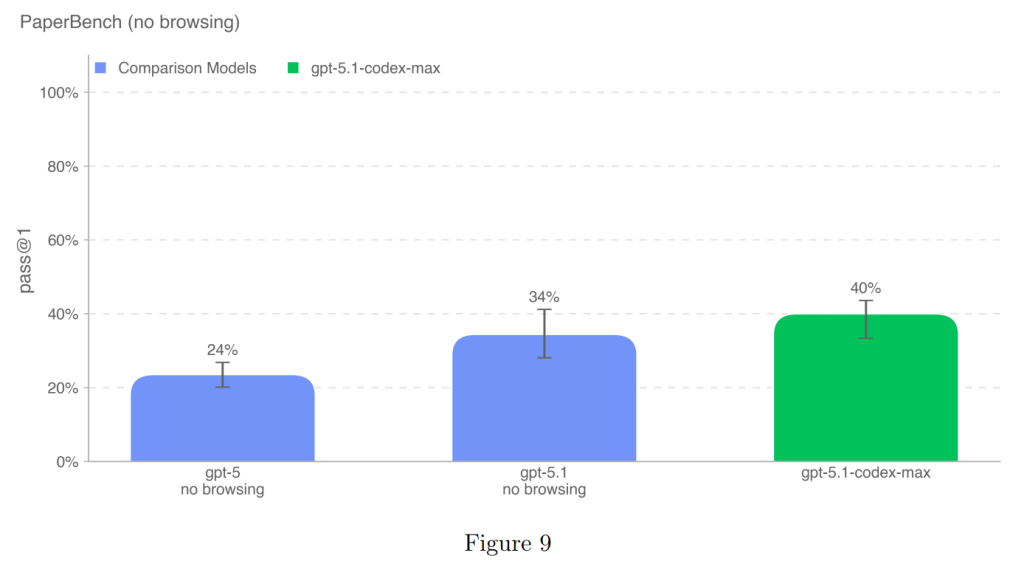 GPT-5.1-Codex-Maxは、40%の成功率(pass@1)を達成し、GPT-5.1(34%)の性能を上回り、OpenAIモデルの中で新たな上限を設定しました(Figure 9)。
