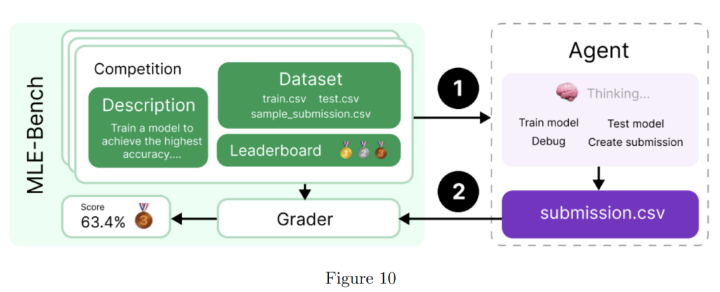 MLE-benchは、エージェントがGPU上で機械学習モデルの設計、構築、訓練を含むKaggleコンペティションを解決する能力を評価します。エージェントには、仮想環境、GPU、およびKaggleのデータと指示セットが与えられ、24時間(一部の実験では最大100時間)で解決策を開発します。