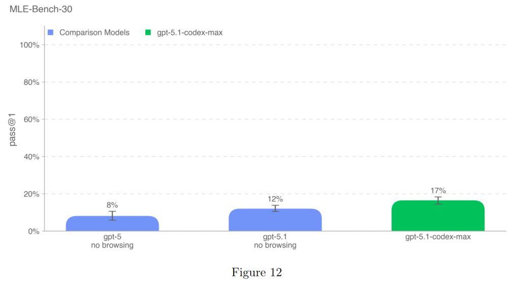 GPT-5.1-Codex-Maxは17%の成功率(pass@1)を達成し、GPT-5.1(12%)の性能を上回り、OpenAIモデルの中で新たな上限を設定しました(Figure 12)。