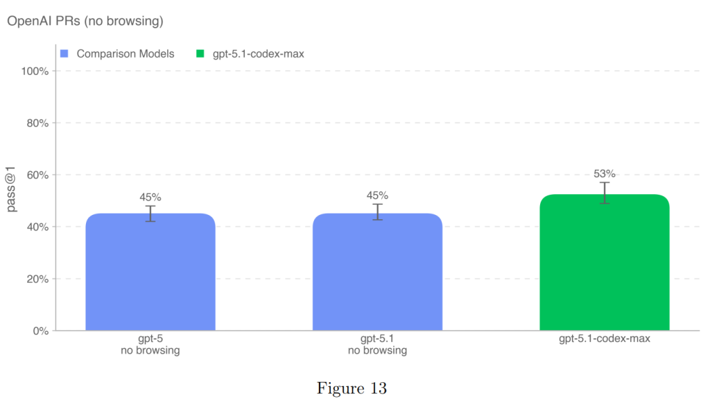GPT-5.1-Codex-Maxは53%の成功率(pass@1)を達成し、GPT-5.1(45%)の性能を上回り、OpenAIモデルの中で新たな上限を設定しました(Figure 13)。