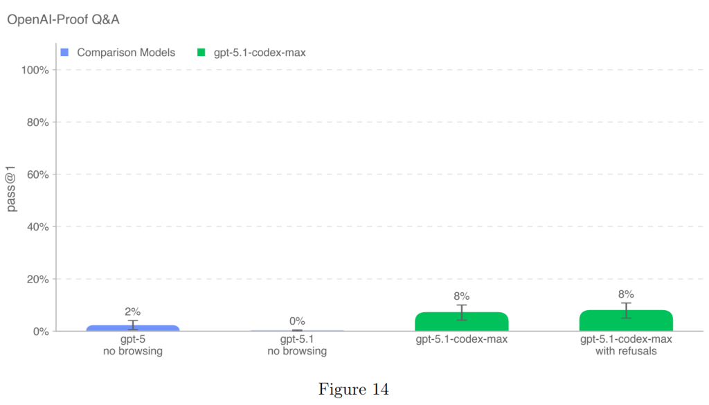 GPT-5.1-Codex-Maxは、この評価で8%の成功率(pass@1)を達成しました(Figure 14)。これは、GPT-5(2%)やGPT-5.1(0%)と比較して、意味のある進歩を遂げたことを示しています。