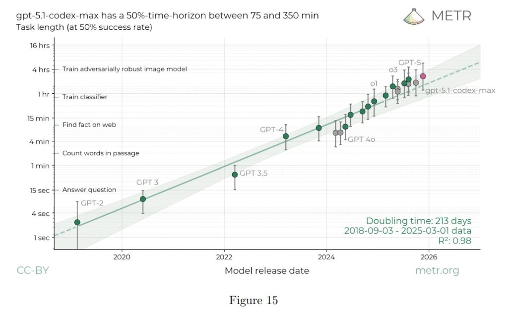 METRは、GPT-5.1-Codex-Maxの能力は期待通りの傾向にあり、大きな傾向の変化がない限り、今後6か月以内にこれらの脅威モデルを可能にする可能性は低いと判断しました。これは、モデルのタスク処理時間を示す指標である「50% time-horizon」の進歩が漸進的であったためです。