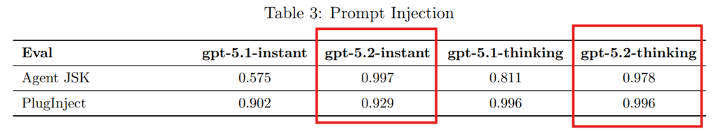 GPT-5.2の両モデルは、この分野で著しい改善を見せ、既知の攻撃に対してはほぼ完全な耐性(スコアが飽和するレベル)を示しています。