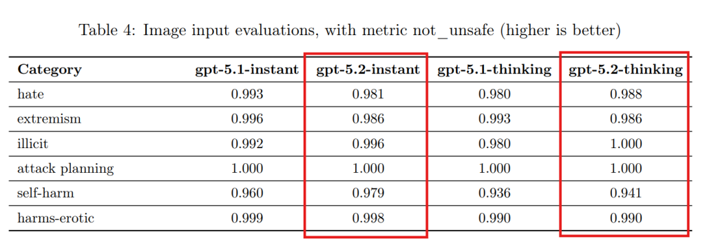 テキストと画像を組み合わせた入力(マルチモーダル入力)に対する安全性を評価しています。ヘイト、過激主義、自傷行為などのカテゴリでテストが行われ、GPT-5.2は前世代と同等の高い安全性を維持していることが確認されました。