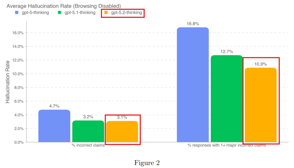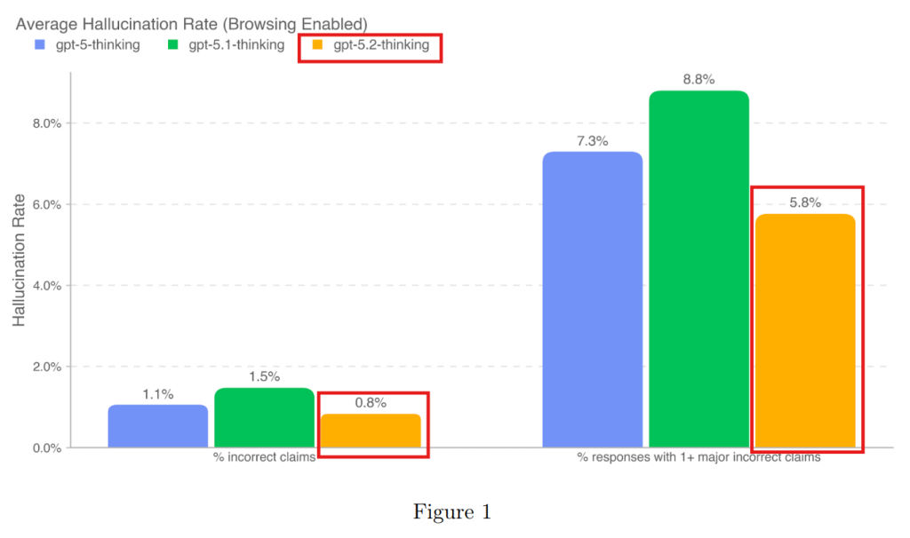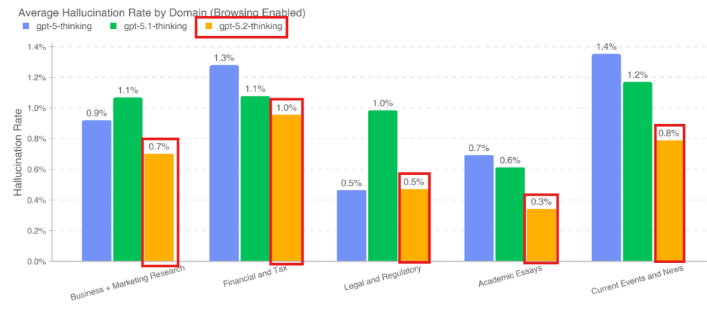 注目すべきは、ブラウジング機能を有効にした場合、GPT-5.2 Thinkingはビジネス、金融、法律などの専門領域において、ハルシネーション率を1%未満に抑えるという非常に高い精度を達成した点です。これは、推論モデルが外部情報を適切に検証・利用できていることを示唆しています。