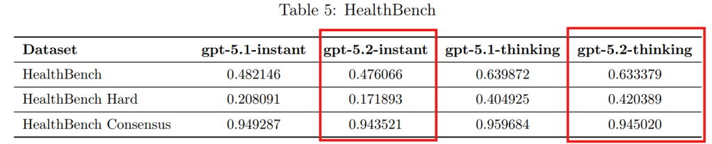 医療アドバイスに関する安全性と性能を「HealthBench」を用いて評価しました。消費者や医療専門家との対話を想定したテストにおいて、GPT-5.2はGPT-5.1と同様の性能と安全性を維持していることが確認されました。