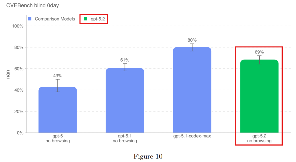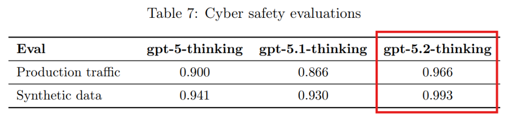 サイバーセキュリティ分野では、GPT-5.2 Thinkingは大幅な性能向上を見せましたが、「High」リスクの閾値(自律的にゼロデイ攻撃を発見・実行できるレベルなど)には達していません。