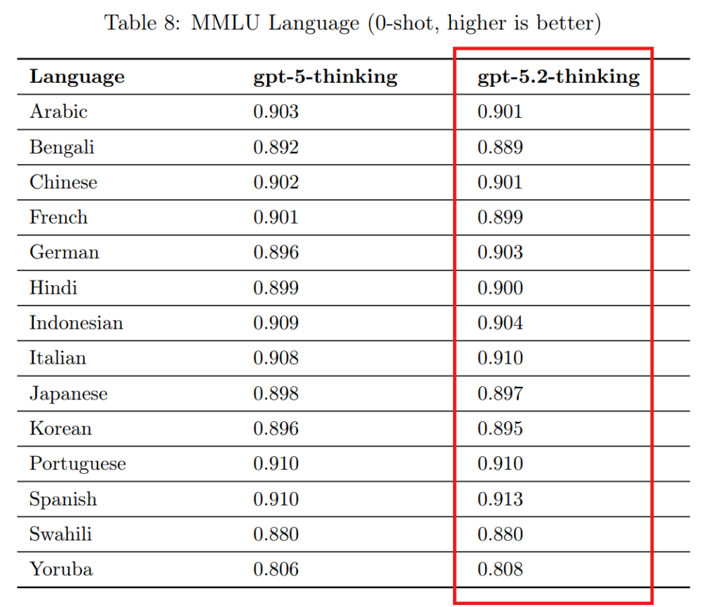 MMLU(大規模マルチタスク言語理解)テストセットを翻訳し、多言語での性能を評価しました。日本語を含む多くの言語において、GPT-5.2 ThinkingはGPT-5 Thinkingと同等の高い性能を示しています。