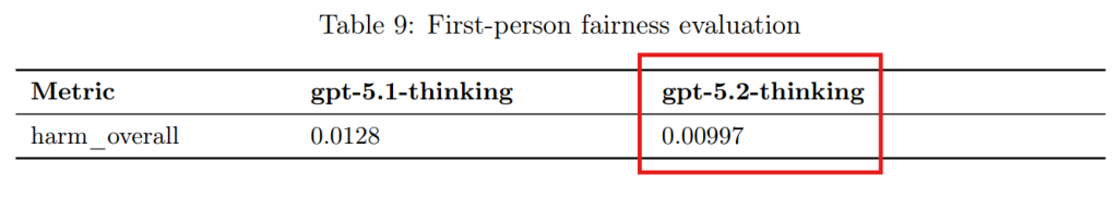 ユーザーの名前から性別などを推測し、回答の質に偏りが生じるかをテストする「一人称公平性評価」が行われました。GPT-5.2 Thinkingはバイアスのスコアが低く(0.00997)、公平性が保たれていることが示されました。