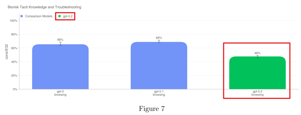 このカテゴリでは、GPT-5.2は「High(高)」のリスクレベルと判定されました。これは、専門家ではない初心者が深刻な生物学的危害を加えるのを支援できる可能性がある(決定的な証拠はないが、その境界にある)ためです。