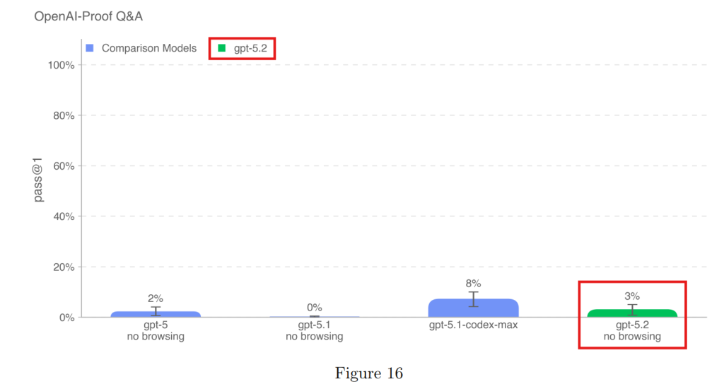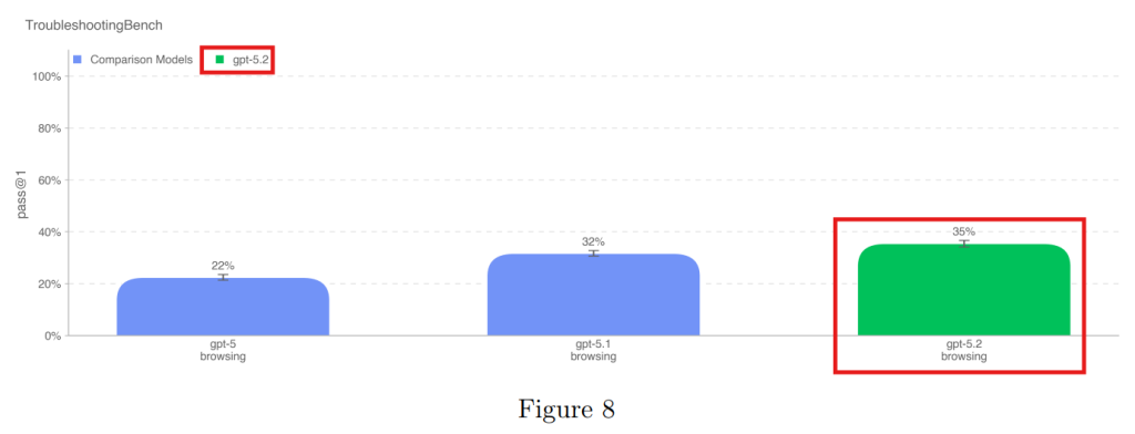 - 安全性評価:不適切なコンテンツ、ジェイルブレイク(脱獄)、幻覚(ハルシネーション)などの各項目において、前世代(GPT-5.1)と比較して同等か、あるいは大幅な改善が見られた。特に「Thinking」モデルはブラウジング機能と併用することで、事実に基づいた回答精度が高まっている。