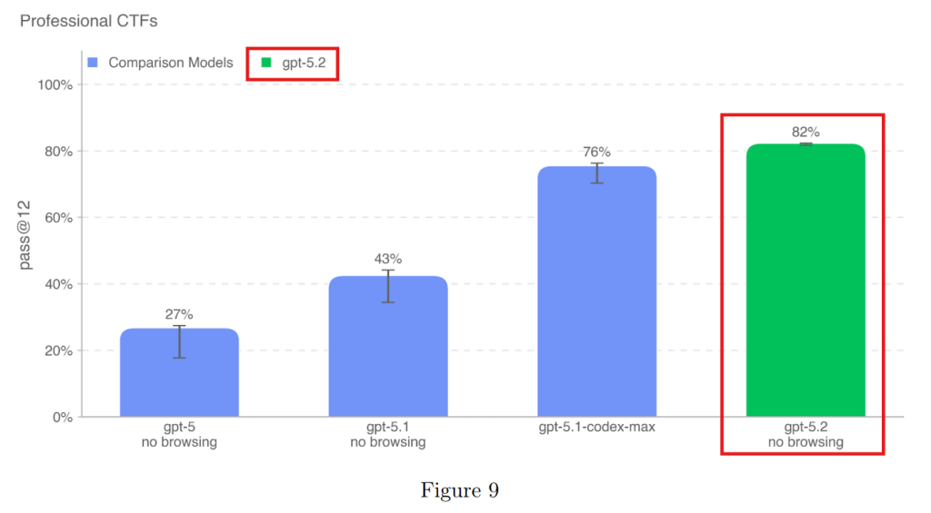 競技形式のセキュリティコンテスト(CTF)の問題を用いた評価です。プロフェッショナルレベルの問題において、GPT-5.2は82%という高い正答率を記録しましたが、これはあくまで限定的な環境での能力です。