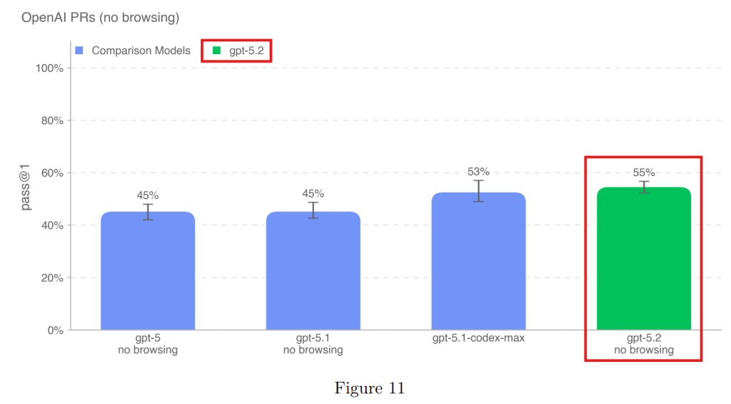 実際のOpenAIのコードベースに対する修正タスクです。GPT-5.2は55%の成功率を記録し、これまでのモデルで最高スコアを出しました。