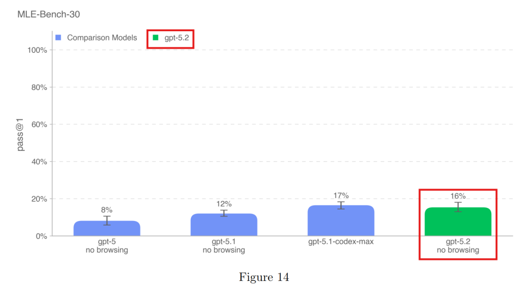 Kaggleのコンペティション課題を解く能力を評価します。GPT-5.2は16%の課題で銅メダル相当の成果を出しましたが、特化型モデルと同程度の性能でした。