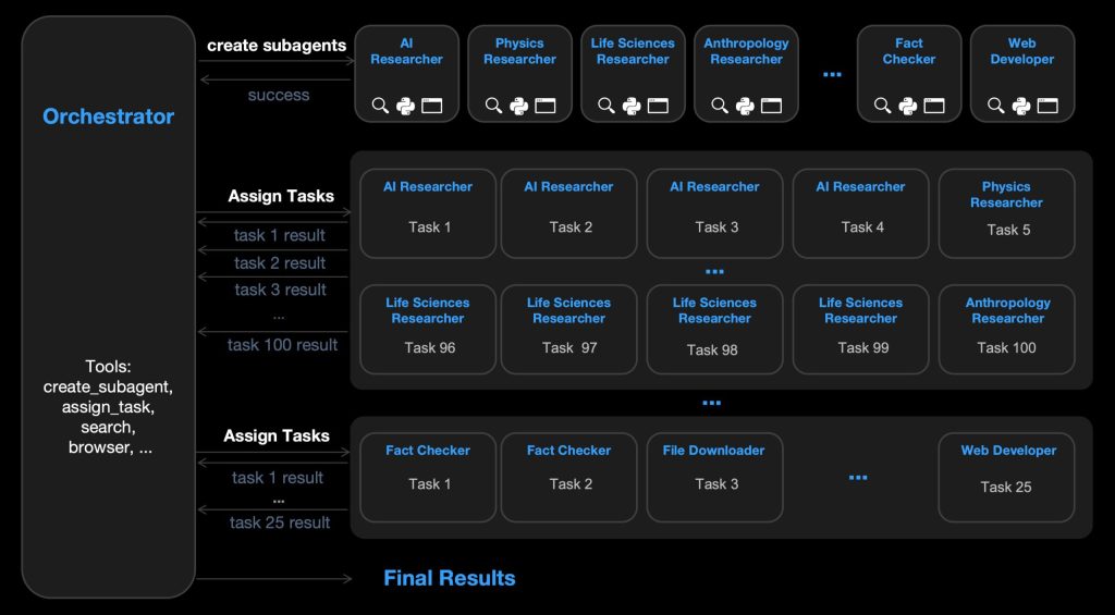 Agent Swarmでは、オーケストレーターエージェントが複雑なタスクを並列化可能なサブタスクに分解し、動的に生成される最大100のサブエージェントに割り当てます。重要な点は、これらのサブエージェントが事前定義されていないことです。タスクに応じて、AI Researcher、Physics Researcher、Fact Checkerなど、専門化されたサブエージェントが自動的に作成されます。