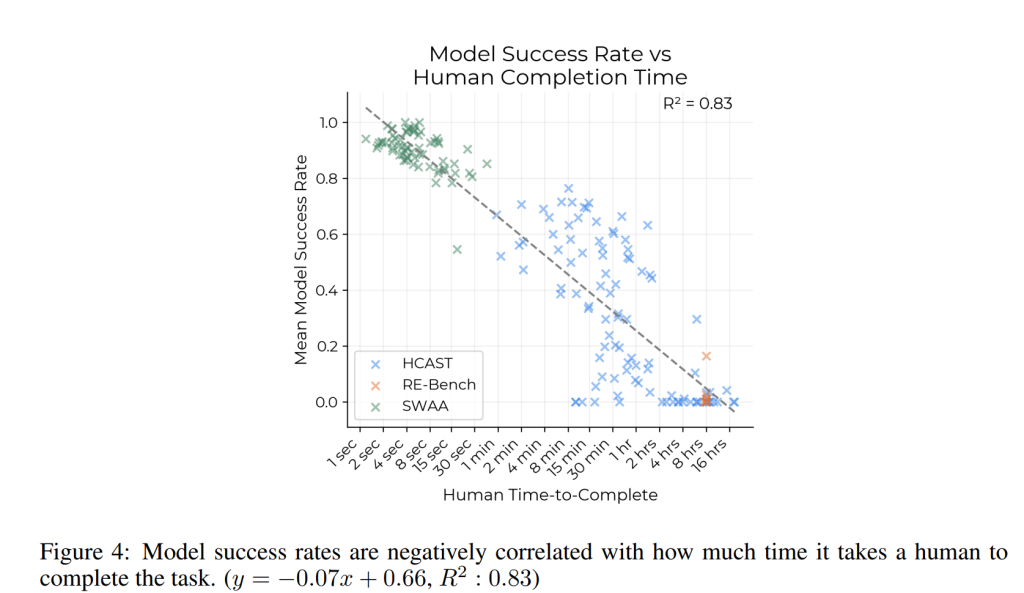 Figure 4は、AIエージェントの成功率が人間の完了時間によって完全に予測されるわけではないことを示しており、他の要因もタスクの難易度に大きく影響していることを意味します。研究数学、計算生物学、法律など、知的労働の異なる領域でモデルを測定すると、それらの時間ホライズンは異なると予想されます。