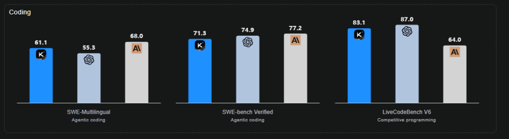 コーディングタスクでは、SWE-bench Verifiedで71.3%、SWE-bench Multilingualで61.1%、Multi-SWE-benchで41.9%を記録しました。これらは実際のソフトウェア開発タスクを模したベンチマークで、多言語対応やマルチステップのエージェント実行を必要とします。一部のベンチマークではGPT-5やClaude Sonnet 4.5に及ばない結果もありますが、全体として高い水準を維持しています。