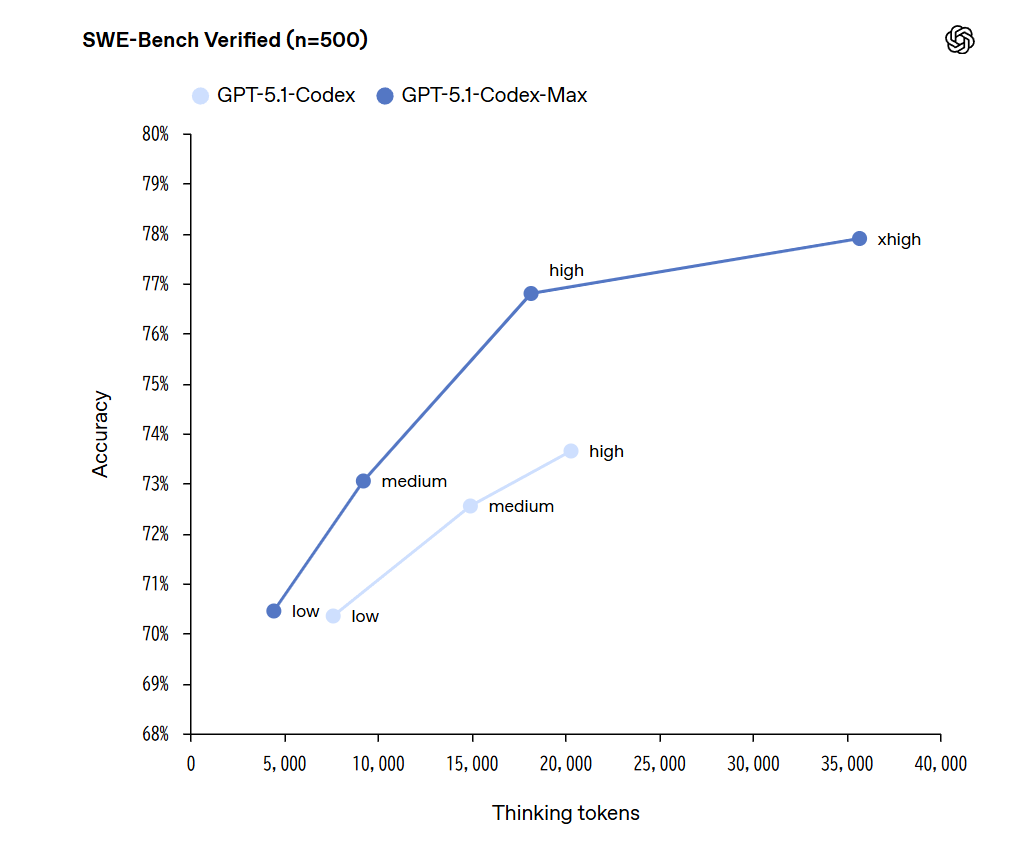 GPT-5.1-Codex-Maxは、より効果的な推論により、トークン効率が大幅に向上しています。OpenAIによれば、SWE-bench Verifiedにおいて、GPT-5.1-Codex-Maxは「medium」推論努力レベルで、GPT-5.1-Codexの同レベルと比較して30%少ない思考トークンで、より優れた性能を達成しました。