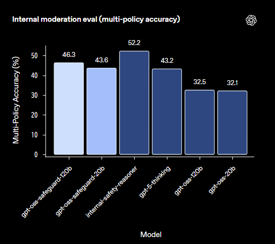 内部評価では、複数のポリシーを同時に提供し、各テスト入力に対してすべてのポリシーで正しく分類できるかを測定しました。OpenAIによれば、これは難易度の高いタスクで、すべてのポリシーのラベルと完全に一致した場合のみ正解とカウントされます。結果として、gpt-oss-safeguard-120bは46.3%、gpt-oss-safeguard-20bは43.6%のマルチポリシー精度を記録し、内部のSafety Reasoner(52.2%)には及ばないものの、gpt-5-thinking(43.2%)やgpt-oss-120b(32.5%)、gpt-oss-20b(32.1%)を上回りました。特に、gpt-oss-safeguardがgpt-5-thinkingを上回ったことは、モデルサイズを考えると驚くべき結果と評価されています。