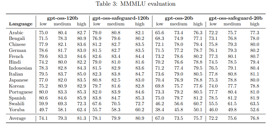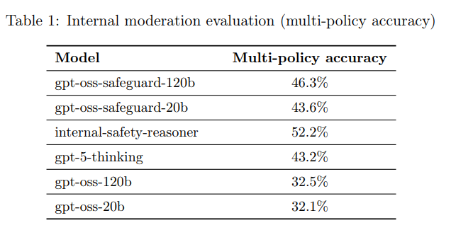 - 厳しいマルチポリシー精度の内部評価において、gpt-oss-safeguardモデルは、gpt-5-thinkingや元の gpt-oss モデルよりも高い性能を示した。