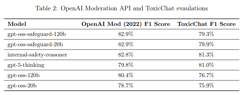 2022年モデレーションデータセットと、公開ベンチマークであるToxicChatが使用されました。2022年モデレーション評価セットでは、gpt-oss-safeguardモデル(F1スコア82.9%)は、内部Safety Reasonerやgpt-5-thinkingを含む他のモデルをわずかに上回りましたが、その差は統計的に有意ではありませんでした。ToxicChat評価では、Safety Reasonerとgpt-5-thinkingが gpt-oss-safeguard モデルをわずかに上回りましたが、モデルサイズを考慮すると、gpt-oss-safeguard が依然としてこの種のタスクに適していると見られています。