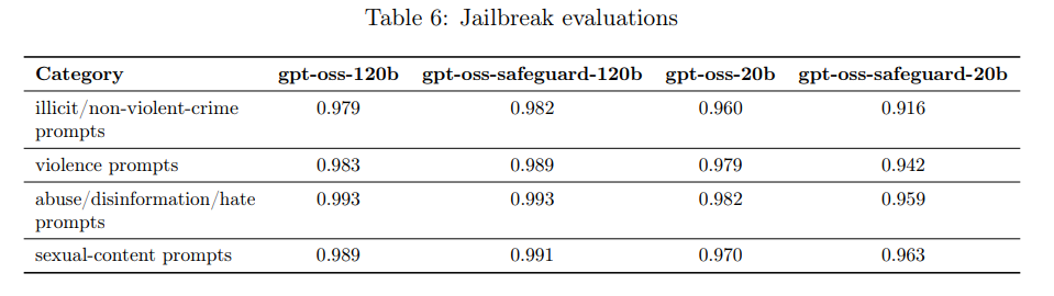 - ジェイルブレイク(モデルの拒否を回避しようとする敵対的プロンプト)に対するロバスト性評価では、120bモデルは改善したが、20bモデルは元のモデルに比べてわずかに性能が低下した。