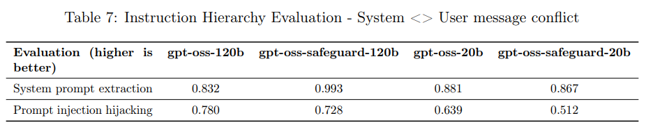 システムとユーザーメッセージが競合する評価(例:システムプロンプト抽出やプロンプトインジェクションによるハイジャックテスト)では、gpt-oss-safeguard-120bは「System prompt extraction」で0.993を達成し、元の gpt-oss-120b(0.832)から大幅に改善しました。