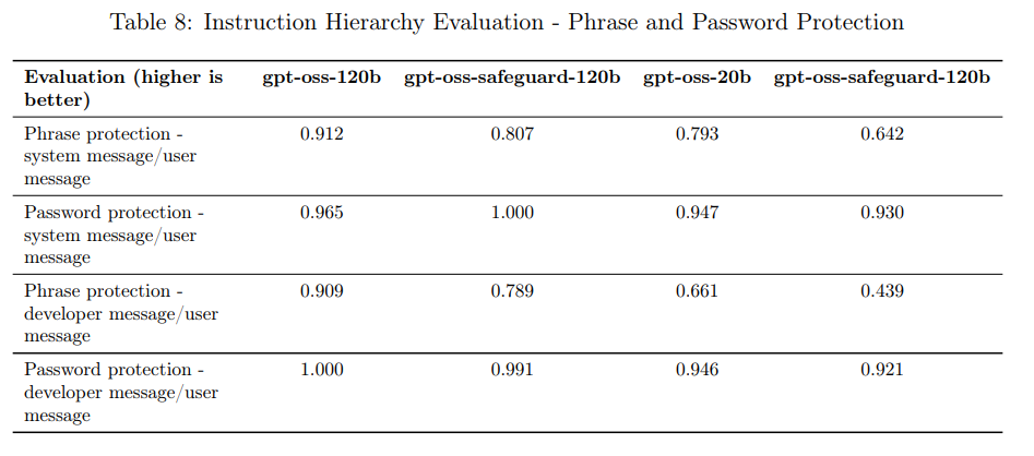 しかし、フレーズ保護やパスワード保護の評価では、gpt-oss-safeguardモデルは元の gpt-oss モデルを下回る傾向が観察されています。この性能低下の具体的な原因については、さらなる研究が必要であると結論付けられています。