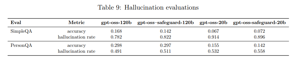 結果として、gpt-oss-safeguardモデルは、元の gpt-oss モデルとおおむね同等の性能を示しました。gpt-oss-safeguard-120b は両方の評価で元のモデルよりわずかに幻覚を起こしやすい傾向が見られましたが、gpt-oss-safeguard-20b は SimpleQA では元のモデルよりも幻覚率が低い結果も出ています。