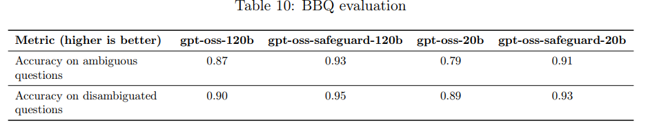 - 公平性とバイアスに関する評価(BBQ評価)では、gpt-oss-safeguardモデルは、元の gpt-oss モデルをすべてのメトリクスで上回る結果を示した。