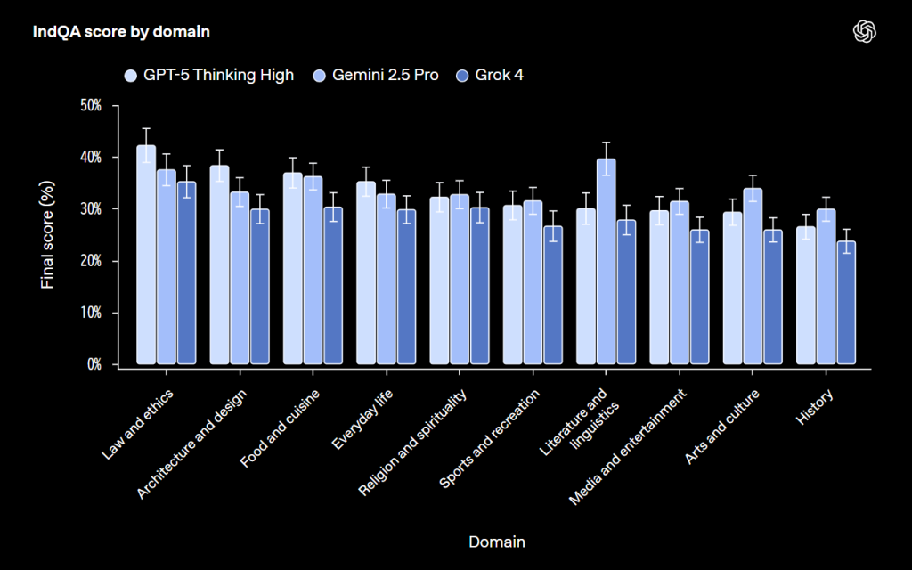 IndQAは、インド文化と日常生活に関する知識と推論を評価するベンチマークです。OpenAIの発表によれば、2,278の質問が12言語と10の文化領域にわたって用意されています。