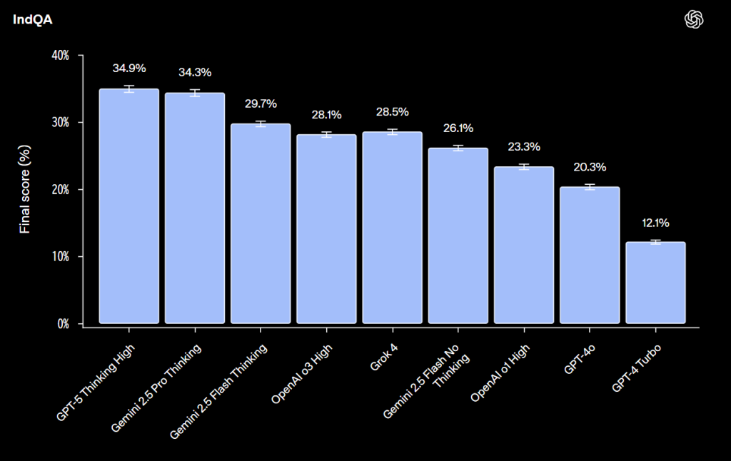 言語別の性能では、GPT-5 Thinking Highはヒンディー語で最も高いスコアを示し、次いでヒングリッシュ、グジャラート語と続きました。