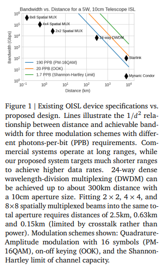 さらに、距離が非常に短い(例:10 cmの望遠鏡で約10 km)場合、空間多重化(Spatial Multiplexing)という新たな機会が生まれます。距離が短いとビームスポットサイズが小さくなるため、異なる衛星上のトランシーバーアレイ間で複数の独立したビームを確立できます。これにより、総帯域幅は並列リンクの数に応じてスケールし、距離に反比例してさらに帯域幅をスケールさせることが可能になります。