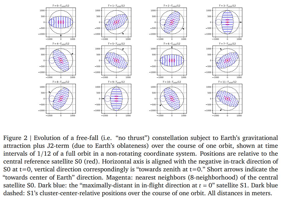 もし地球の重力場が点質量によるもので、大気抵抗や放射圧などの摂動(Keplerianではない影響)がなければ、この「自由落下(free fall)」コンステレーションは、デルタV(速度変更)を必要とせずに1軌道後に完全に自己再生されます。簡単に言えば、現実の宇宙環境で衛星に働くさまざまな妨害要因(摂動)を取り除いた、最もシンプルな物理法則の下であれば、この衛星クラスターは推進力を使わずに完璧に編隊を維持できます。