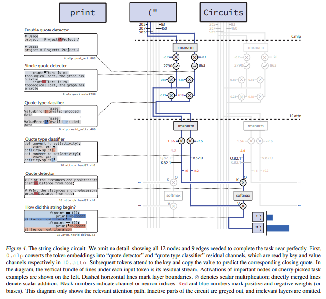 - 文字列の終了: その後のレイヤー10のアテンションヘッド(10.attn.head82)が、「クォート検出器」をキー(Key)として、「クォートタイプ分類器」をバリュー(Value)として使用することで、対応するクォートを予測し、文字列を閉じます。
