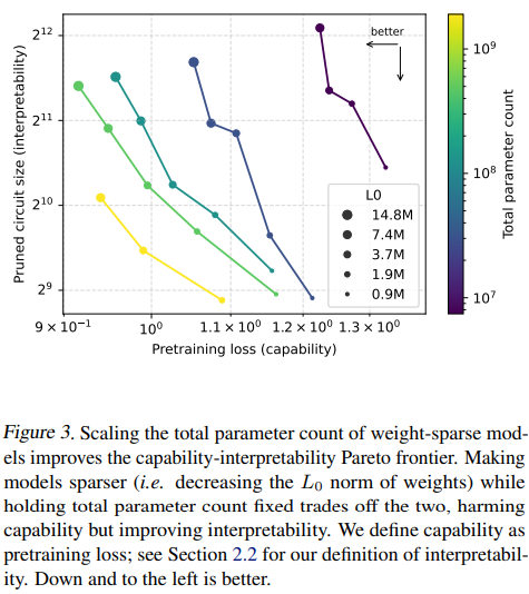 - 能力と解釈性のフロンティア: モデルサイズをスケールアップさせると、能力(事前学習損失)と解釈性(プルーニングされた回路サイズ)のパレートフロンティアが改善します。重み \(L_0\) を固定し、より大きなモデルを使用すると、能力と解釈性の両方が向上することが確認されました。