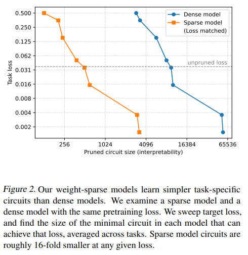 - 解釈性の向上と回路の単純化: 重みをスパース化(非ゼロの重みを制限)することで、モデルの計算が大幅に単純化され、タスク固有の回路(計算経路)が、同等の事前学習損失を持つ密なモデルと比較して約16分の1のサイズで抽出可能となった。